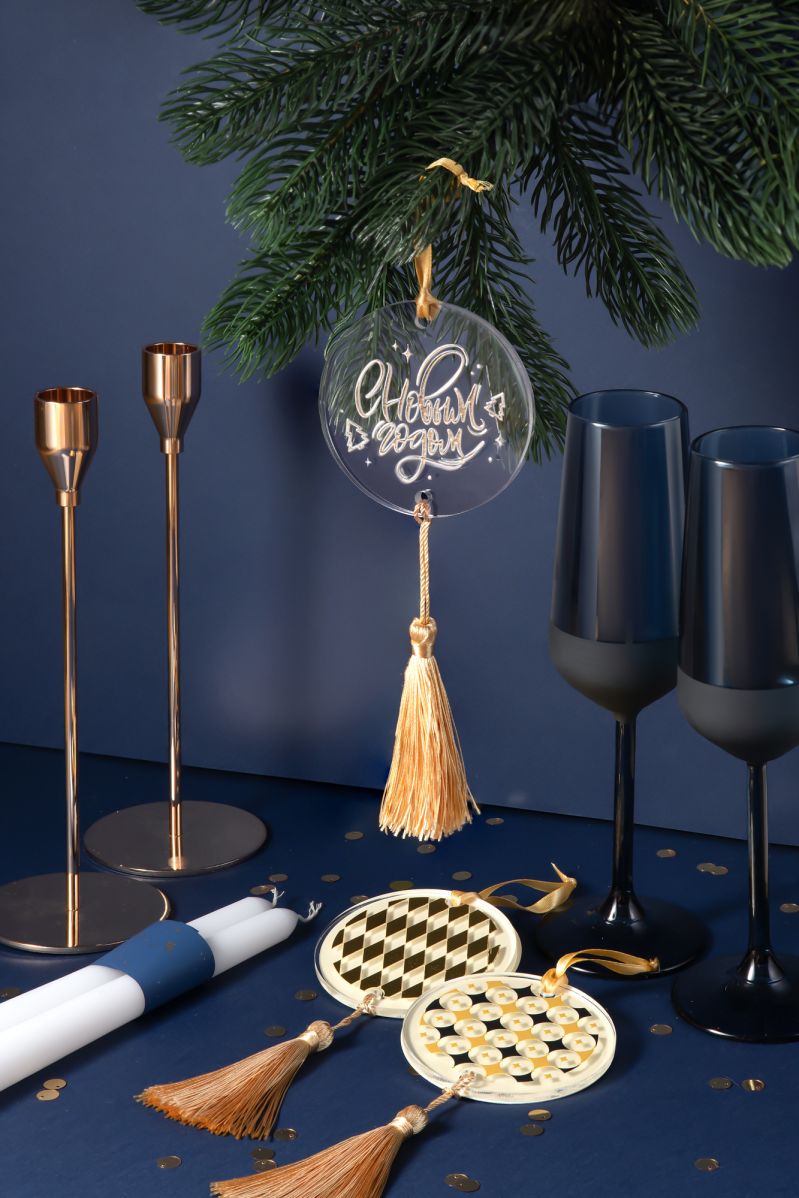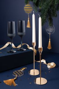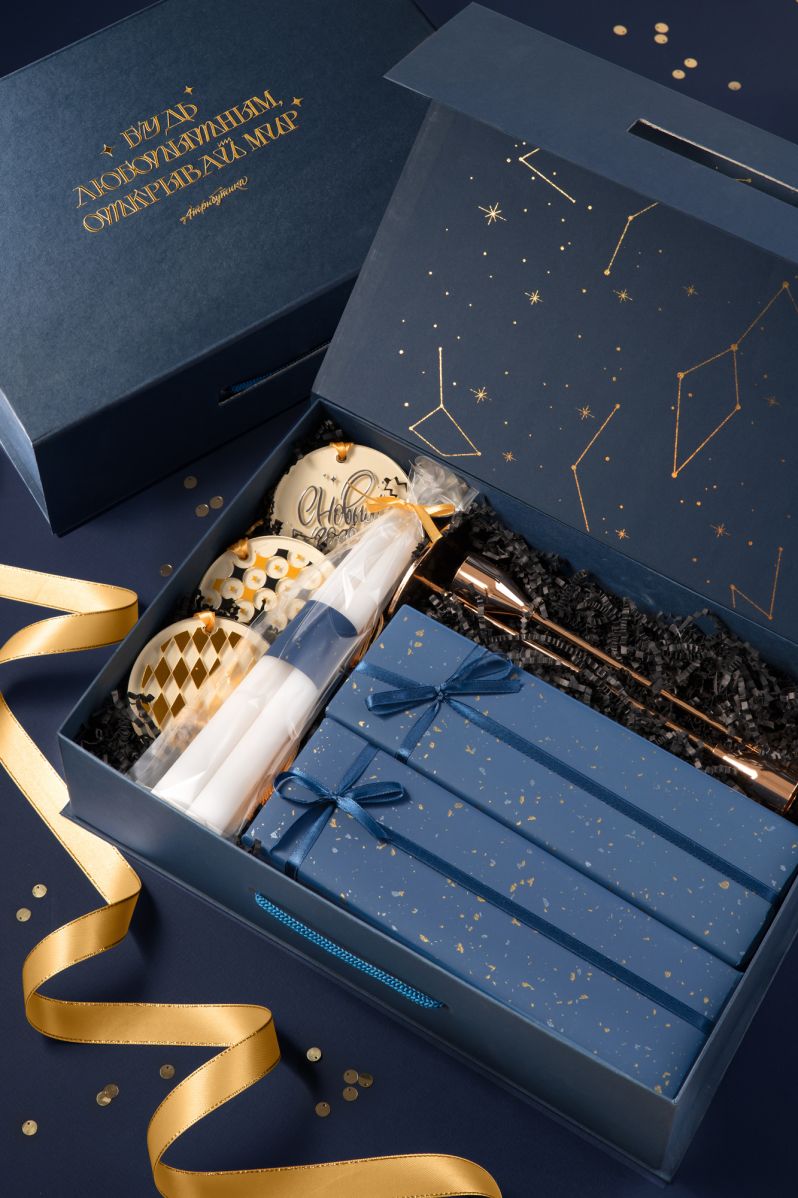 Состав:Открытка (брендируется) , Коробка подарочная с ДТФ наклейкой , Бокал в коробочке в крафтовой бумаге с лентой, 2 шт , Игрушка елочная акриловая с подложкой в пакетике, 3 шт , Подсвечник античный золото, 2 шт , Свечи античные, 2 шт