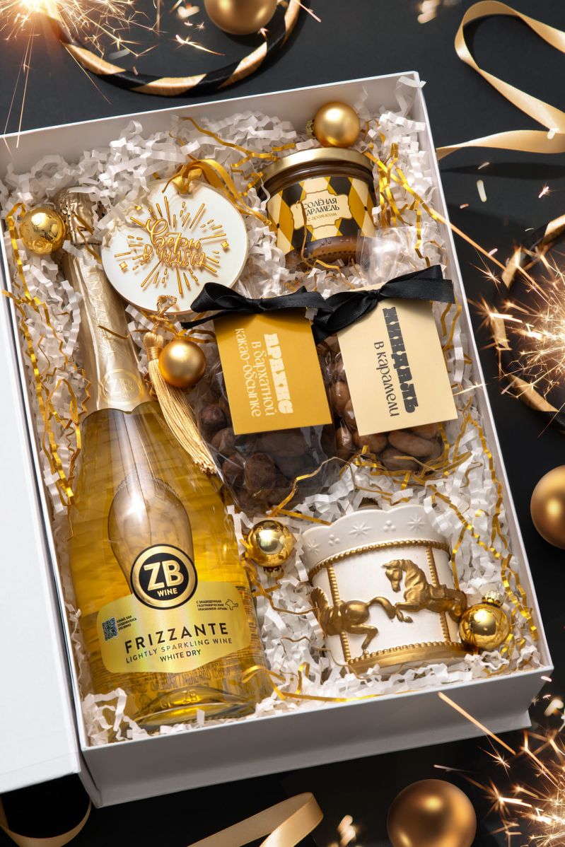 Состав:Декор , Коробка из картона с наклейкой на крышке (брендируется) , Напиток 0.7 л , Бумажный наполнитель , Соленая карамель в манжете , Арахис в какао обсыпке 150г в пакетике с тегом , Миндаль в карамели 125 г в пакетике с тегом , Свеча “Карусель” , Игрушка акриловая с подложкой