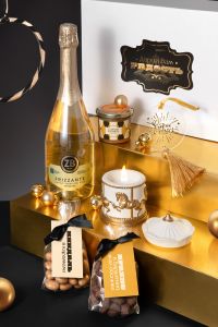 Жемчужины набора: свеча в гипсовом основании “Карусель”, игрушки на елку из акрила, которые могут быть брендированы вашим лого, угощения, в том числе, напиток.