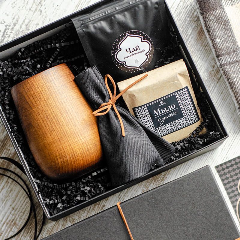 Так, например, оригинальным подарком для клиентов на сезонные праздники может стать подарок Биосфера, в комплект которого входят аксессуары из дерева - настольный органайзер и пробковая подставка под кружку. Или подарок Relax Black со стильным деревянным стаканом, а также чаем и эфирными маслами.