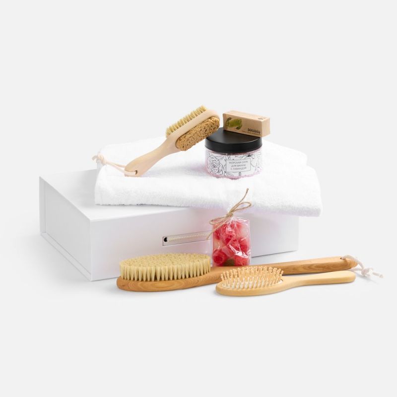 Набор Royal Retreat — роскошный и вдохновляющий набор, который поможет провести настоящий SPA-ритуал не выходя из дома. В нем есть все, что нужно для получения исключительно приятных ощущений: массажные щетки для тела и стоп, ароматная соль для ванны, нежное мыло, питательная помада и мягкое полотенце.