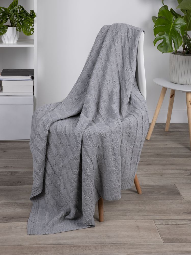 Плед мягкого натурального оттенка с ненавязчивым классическим узором «косы» добавит спокойного шика в интерьер, гармонично впишется в композицию современной гостиной или спальни.
