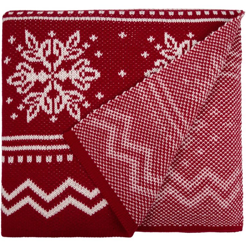 Плед с вывязанным логотипом и индивидуальным рисунком в фирменной цветовой гамме.