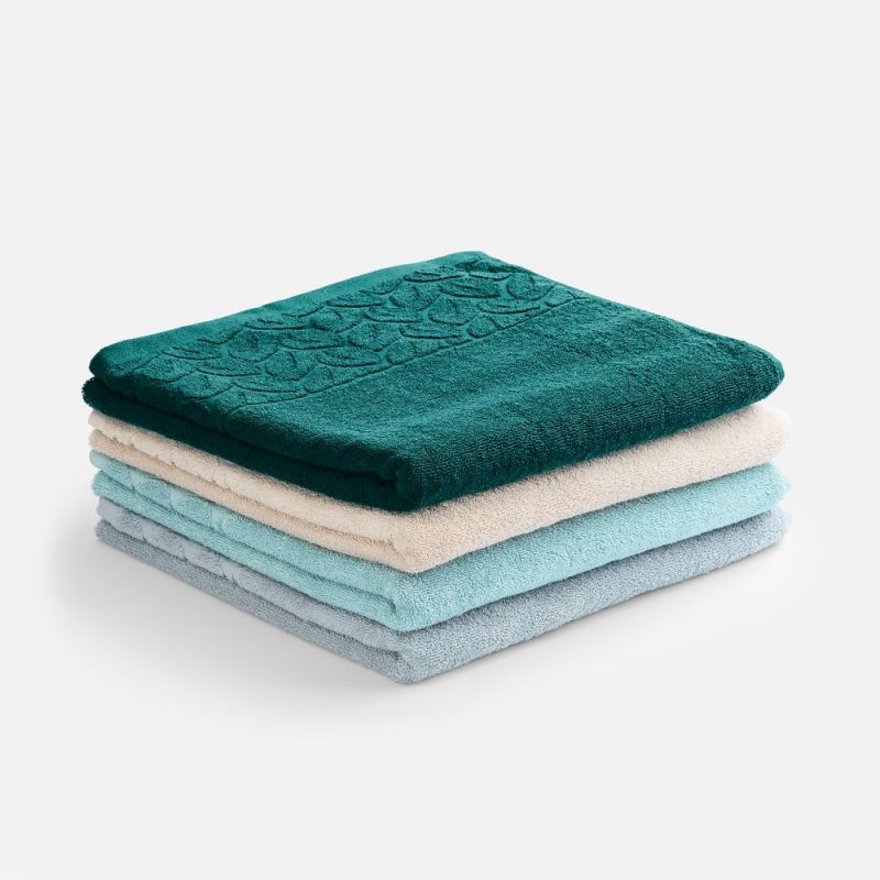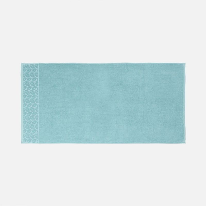 Светлые оттенки в сочетании с широким бордюром с рельефным растительным узором придают полотенцу элегантный и свежий вид.