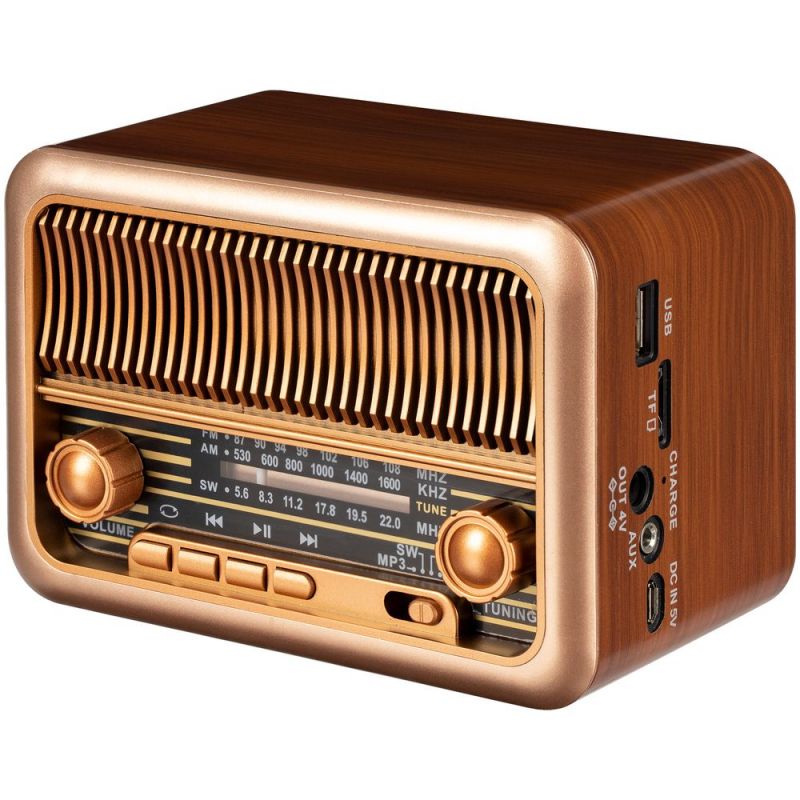 За корпусом, всем своим видом отсылающим к актуальному стилю мидсенчури, скрываются вполне современные функции: возможность воспроизведения музыки по Bluetooth и с карт памяти различного формата.