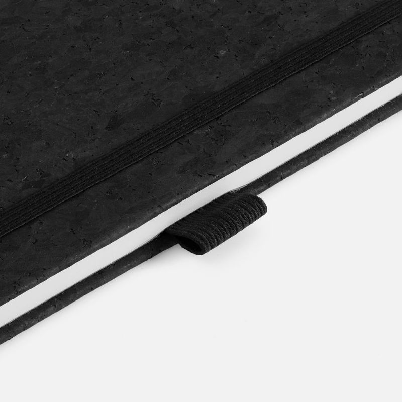 Блокнот с твердой обложкой из натуральной окрашенной пробки, дополнен петлей-резинкой для ручки, ляссе и резинкой в цвет обложки.