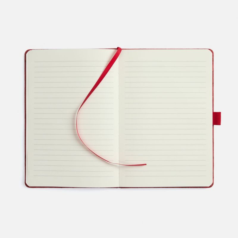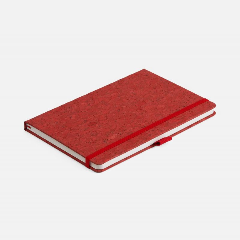 Блокнот с твердой обложкой из натуральной окрашенной пробки, дополнен петлей-резинкой для ручки, ляссе и резинкой в цвет обложки.