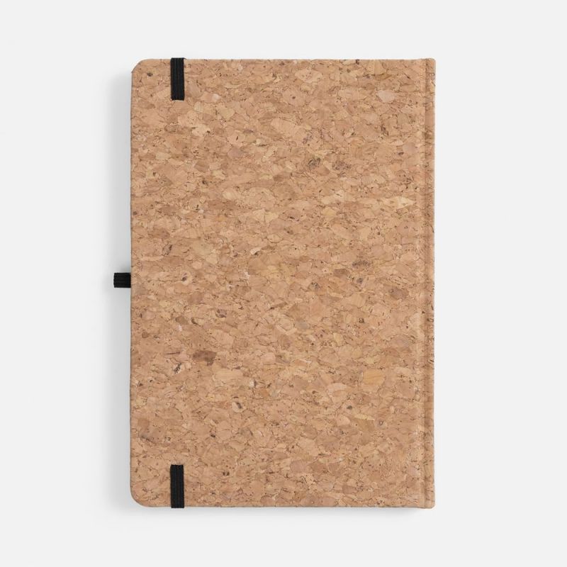 Блокнот в твердой обложке из натуральной неокрашенной пробки, дополнен цветными петлей-резинкой для ручки, ляссе и резинкой на обложку.