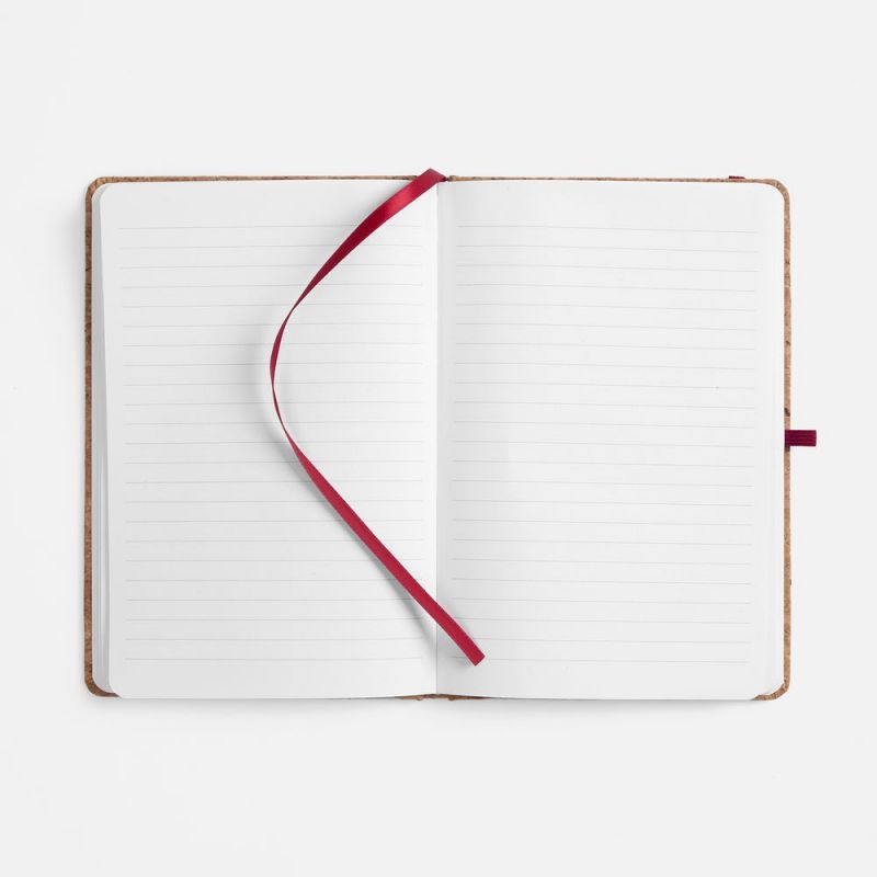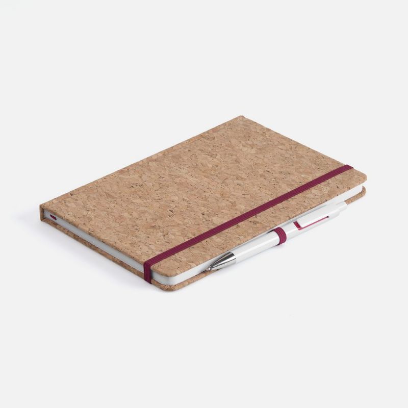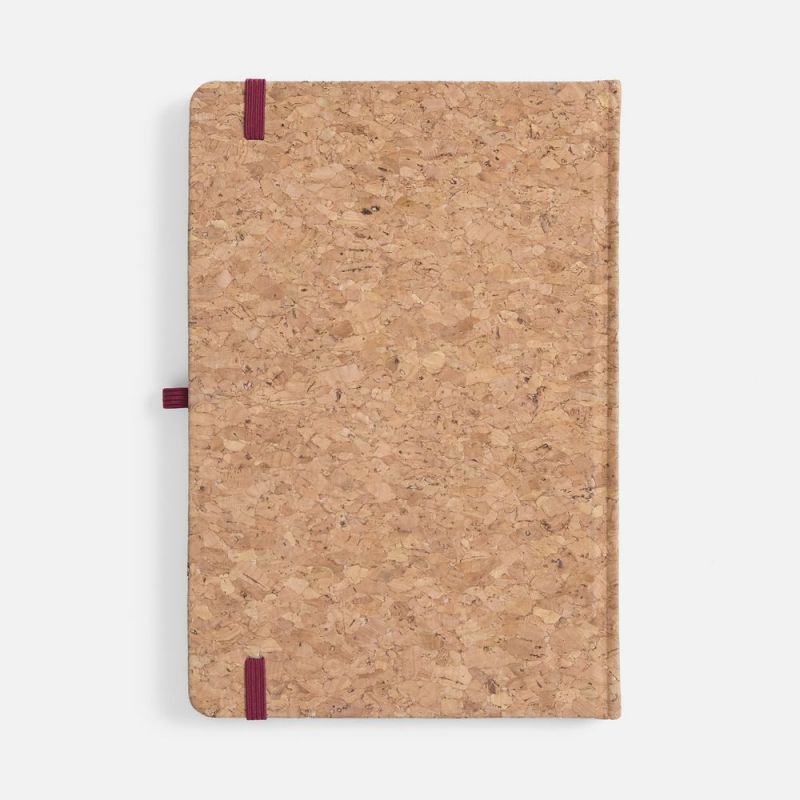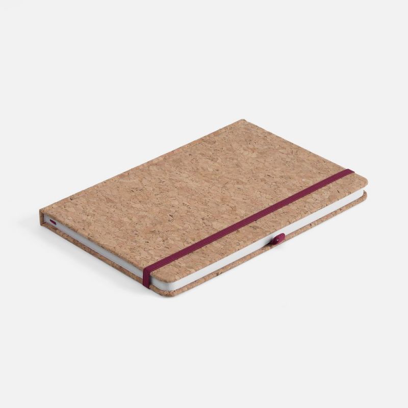 Блокнот в твердой обложке из натуральной неокрашенной пробки, дополнен цветными петлей-резинкой для ручки, ляссе и резинкой на обложку.