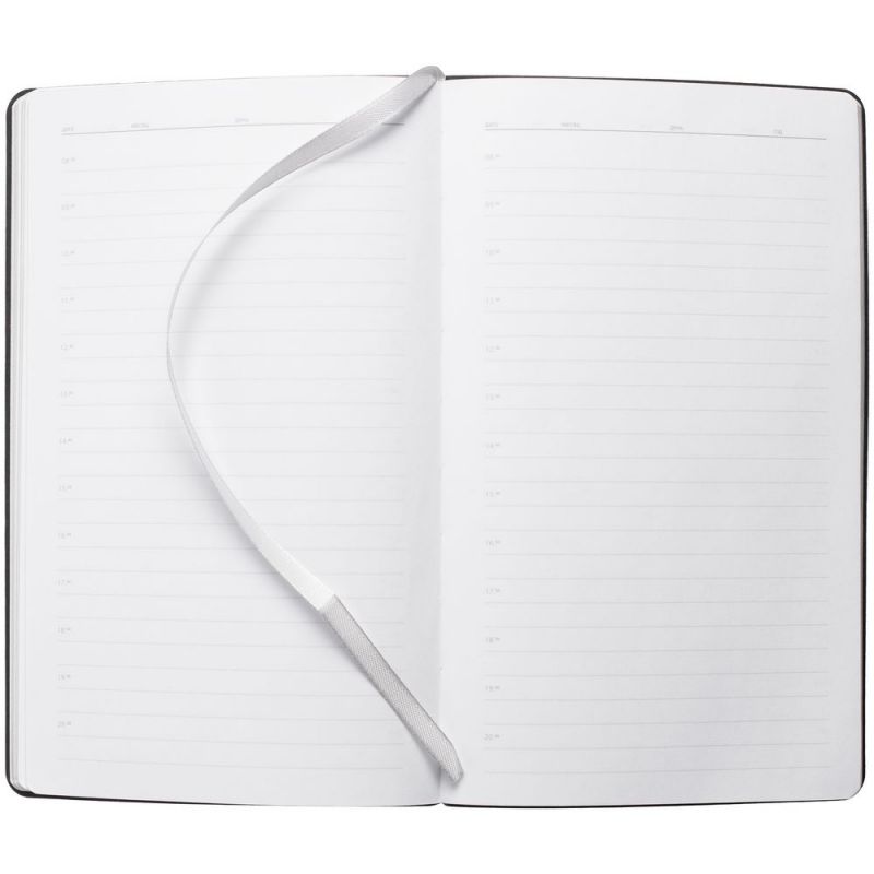 Ежедневник с гибкой обложкой и металлическим корешком, выполнен из материала Soft Touch, черный АА, дополнен серебристым обрезом блока и ляссе.