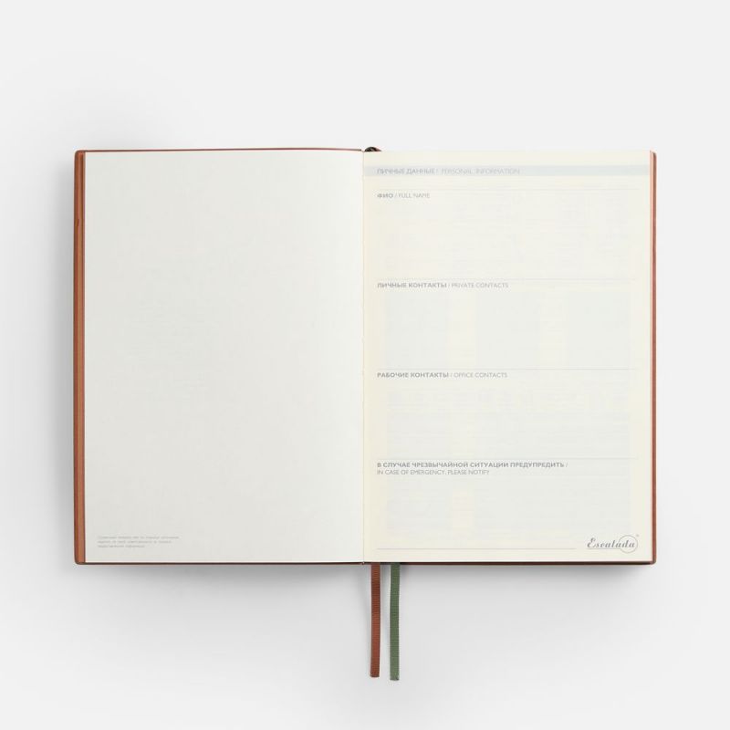 Ежедневник с гибкой обложкой и закладкой из искусственной кожи, дополнен капталом и двойным ляссе.