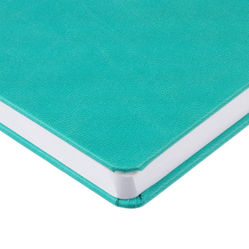 Ежедневник с твердой обложкой, выполнен из материала Latte, цвет морской волны II, дополнен ляссе в цвет обложки.
