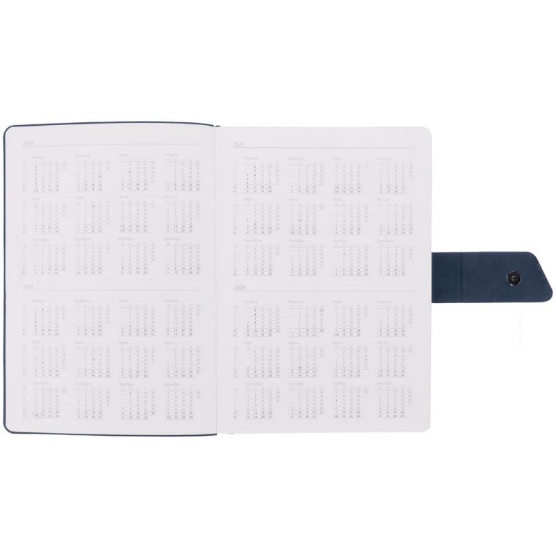 Ежедневник с гибкой обложкой, выполнен из материала La Fite, черный АА и Nubuck, темно-синий ХХ, дополнен синим ляссе и хлястиком на кнопке.