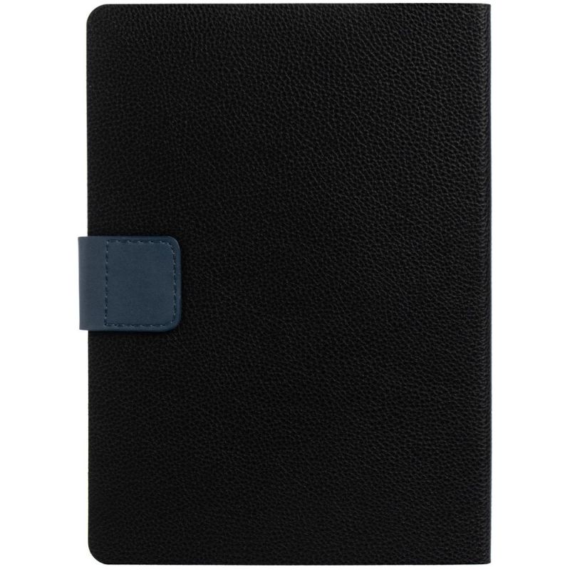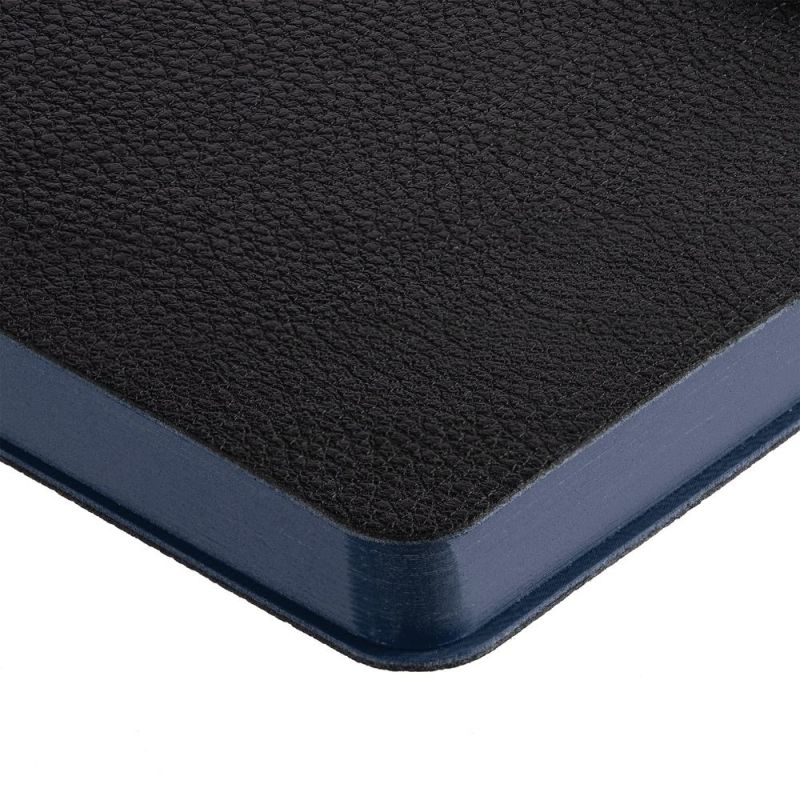 Ежедневник с гибкой обложкой, выполнен из материала La Fite, черный АА и Nubuck, темно-синий ХХ, дополнен синим ляссе и хлястиком на кнопке.