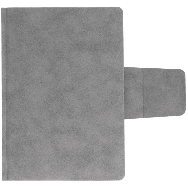 Ежедневник с твердой обложкой c поролоном, выполнен из материала Nubuck, серый СС, дополнен капталом и ляссе серого цвета. Застежка — хлястик на магните.