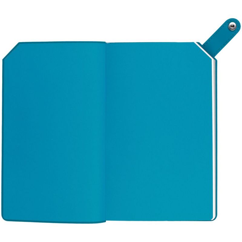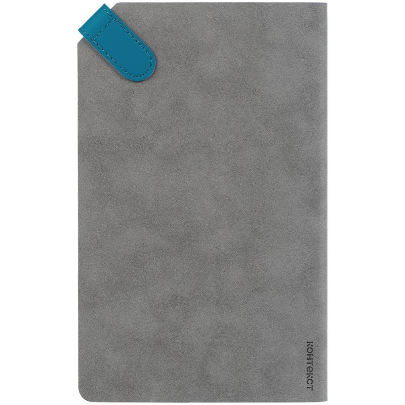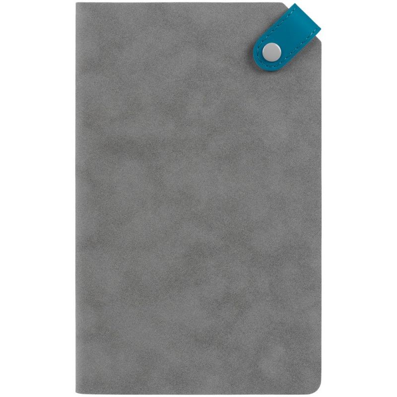 Ежедневник с гибкой обложкой, выполнен из материала Nubuck, серый СС и Soft Touch, морская волна II; дополнен серым ляссе и хлястиком на кнопке.