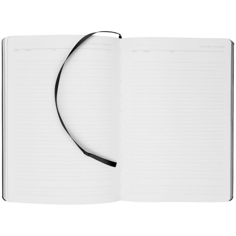 Ежедневник с твердой обложкой и тонированным обрезом. Выполнен из материала Latte, черный, дополнен ляссе в цвет обложки.