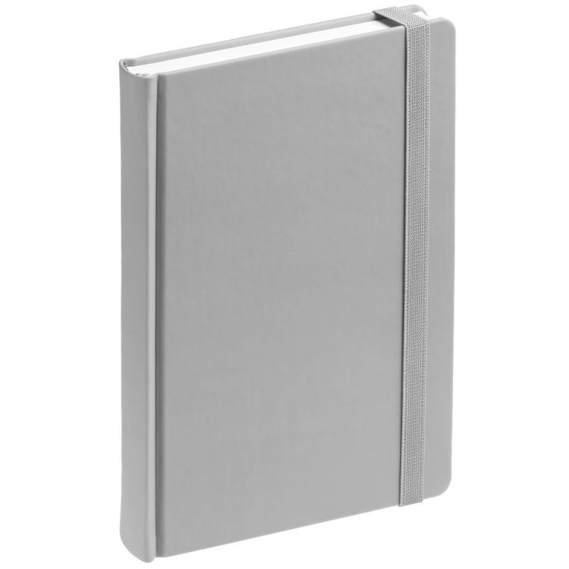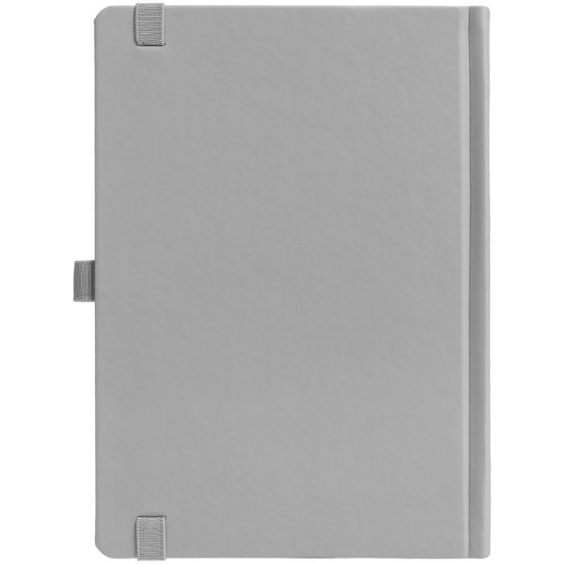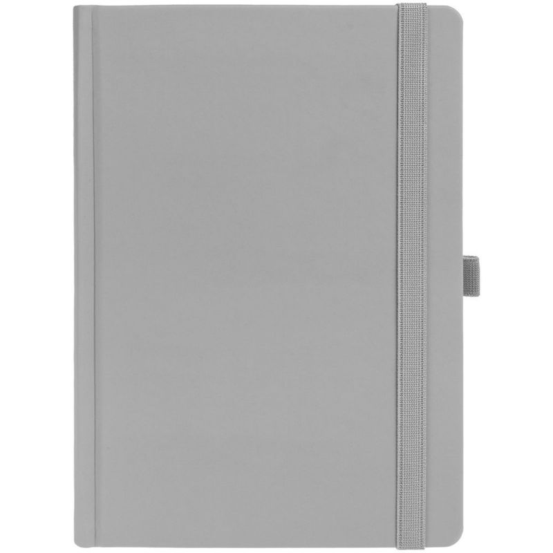 Ежедневник с твердой обложкой без поролона, выполнен из материала Soft Touch, серый СС, дополнен резинкой шириной 1 см, петлей-резинкой для ручки, капталом и ляссе серого цвета.