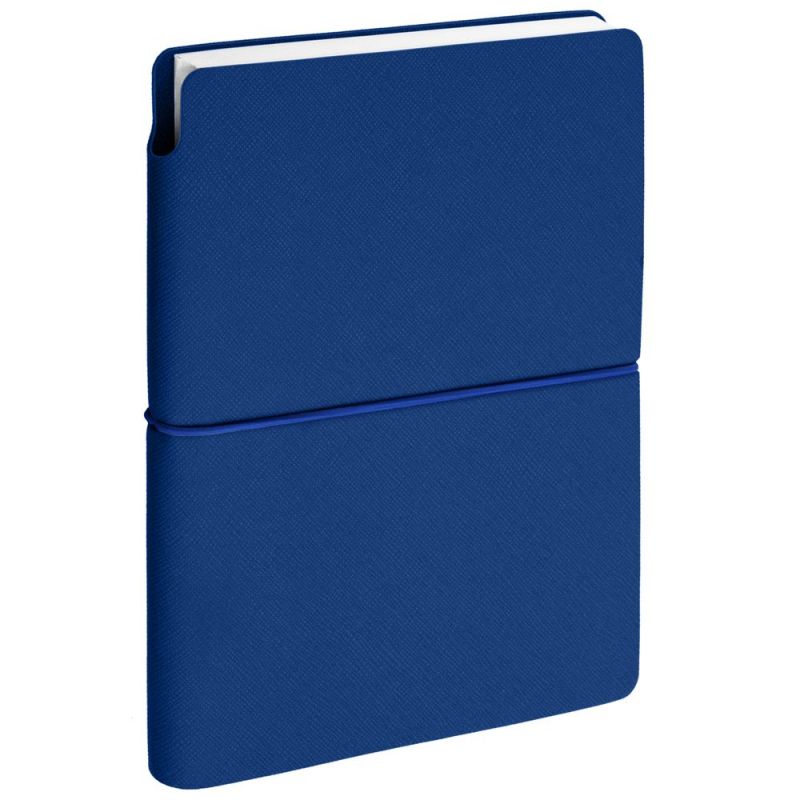 Ежедневник с гибкой обложкой выполнена из материала Nice Touch, синий и Latte, синий (внутренняя часть обложки), дополнен горизонтальной резинкой в цвет обложки. Внутри корешка — специальное место для крепления ручки размером до 15х1 см.