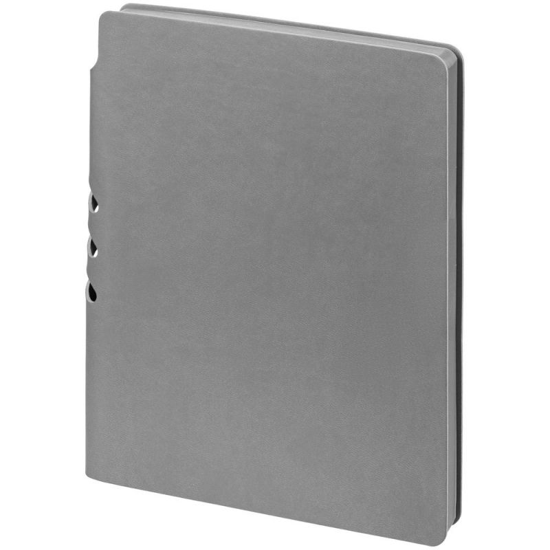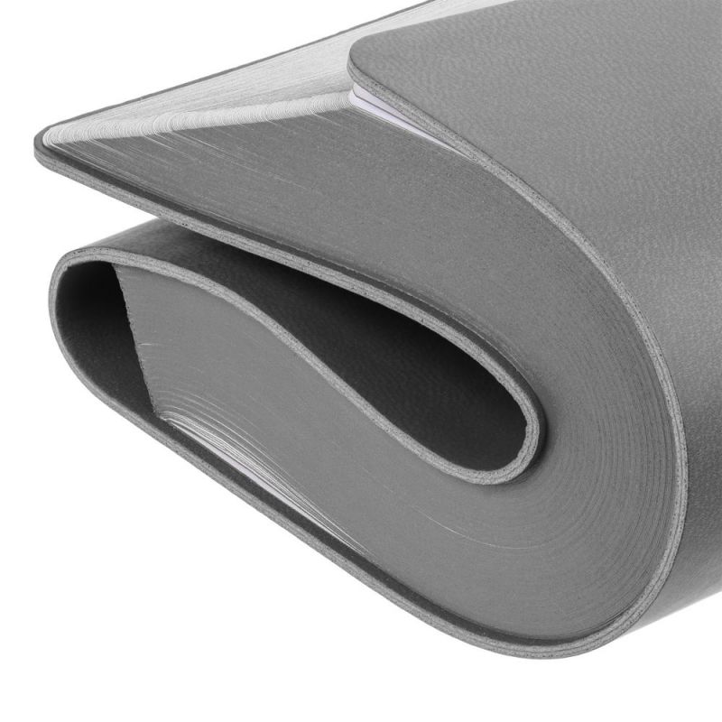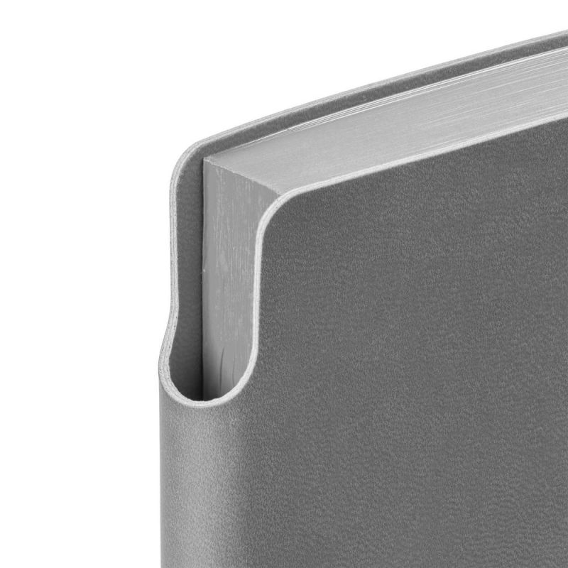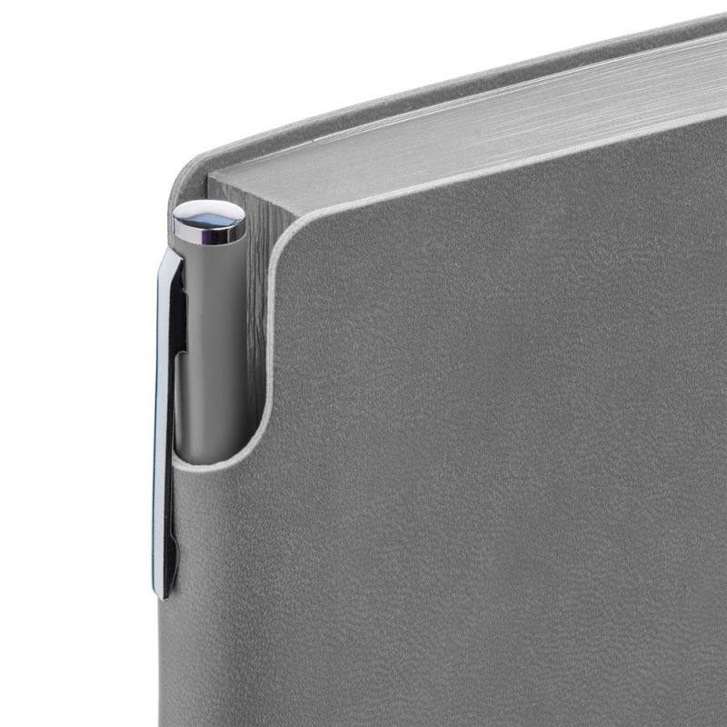 Гибкая обложка ежедневника выполнена из материала Latte, серый СС. Внутри корешка — специальное место для крепления ручки размером до 15х0,9 см.