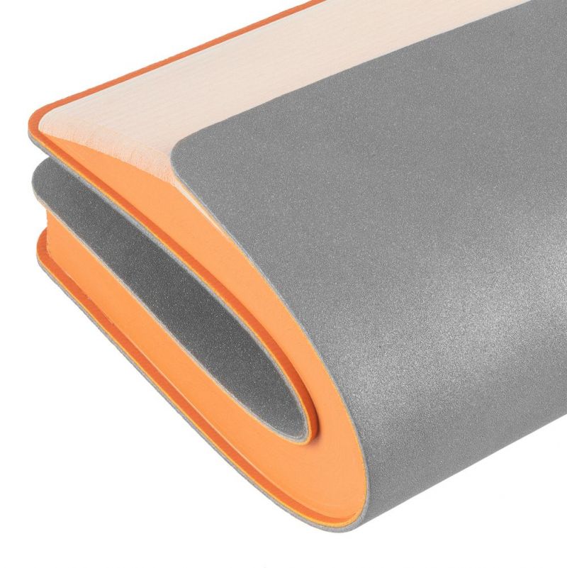Гибкая обложка выполнена из материала Velour Melange, серый СС и Latte, оранжевый OO (внутренняя часть обложки). Внутри корешка — специальное место для крепления ручки размером до 15х0,9 см.