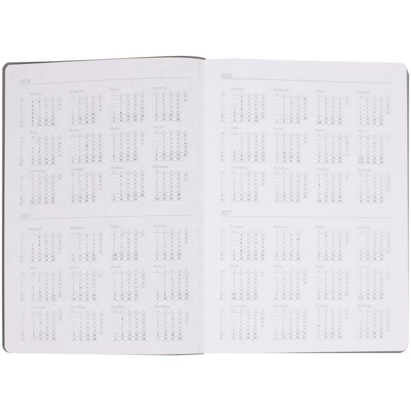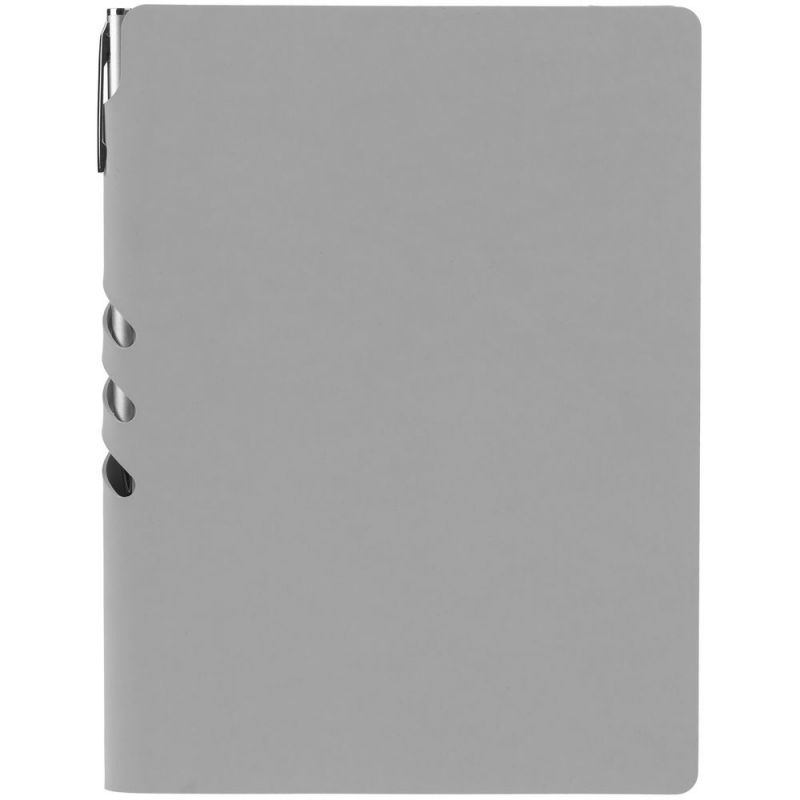 Гибкая обложка выполнена из материала Soft Touch, серый СС и Latte, серый СС (внутренняя часть обложки). Внутри корешка — специальное место для крепления ручки размером до 15х1 см.