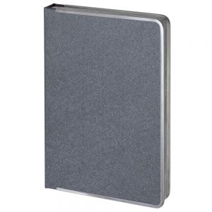 Ежедневник с твердой обложкой и серебристым обрезом, выполнен из материала Saffian, темно-серый, дополнен серым ляссе и металлическими рамками.
