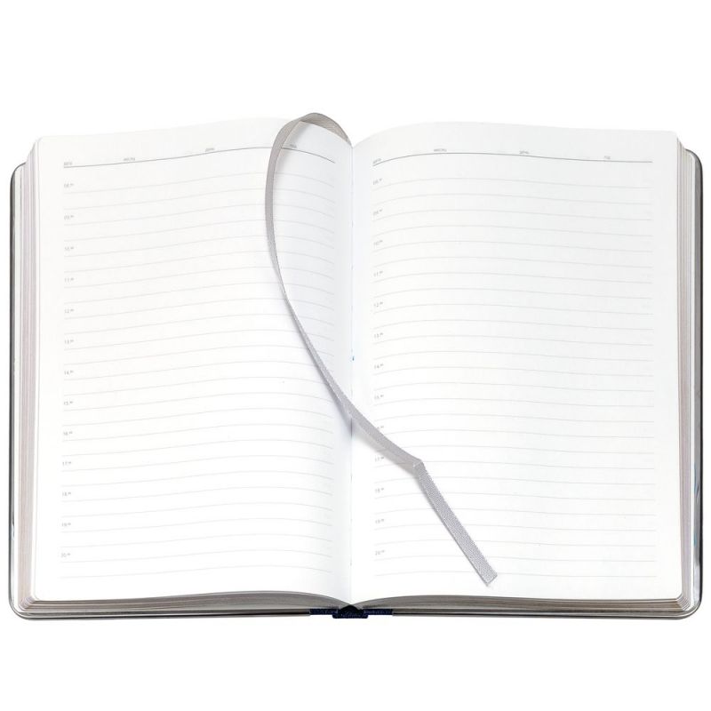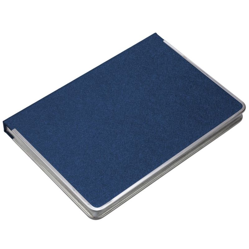 Ежедневник с твердой обложкой и серебристым обрезом, выполнен из материала Saffian, синий, дополнен серым ляссе и металлическими рамками.