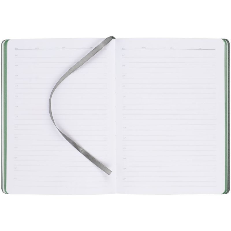 Ежедневник с твердой обложкой, выполнен из материалов Soft Touch Ultra, зеленый FF и La Fite, серый СС. Ляссе темно-серого цвета.