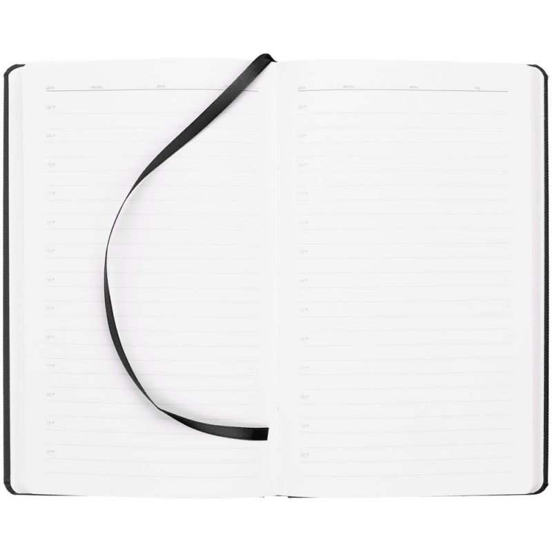 Ежедневник с твердой обложкой, выполнен из материала Canyon, черный АА, дополнен ляссе в цвет обложки.