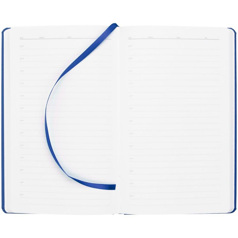 Ежедневник с твердой обложкой, выполнен из материала Canyon, синий НН, дополнен ляссе в цвет обложки.