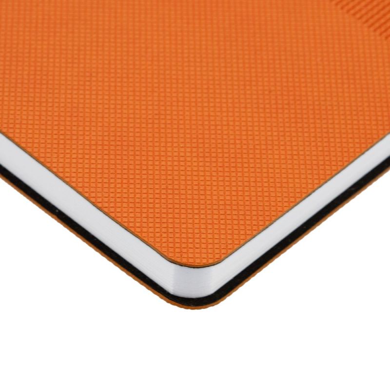 Ежедневник с гибкой обложкой, выполнен из материала Canyon, оранжевый ОО, дополнен ляссе в цвет обложки. Блинтовое тиснение на обложке создает эффект вязаного полотна.