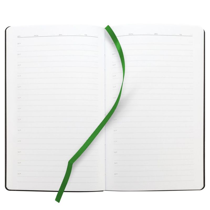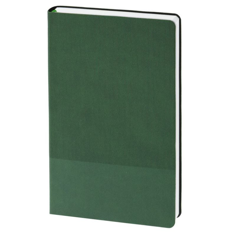 Ежедневник с гибкой обложкой, выполнен из материала Canyon, зеленый FF, дополнен ляссе в цвет обложки. Блинтовое тиснение на обложке создает эффект вязаного полотна.