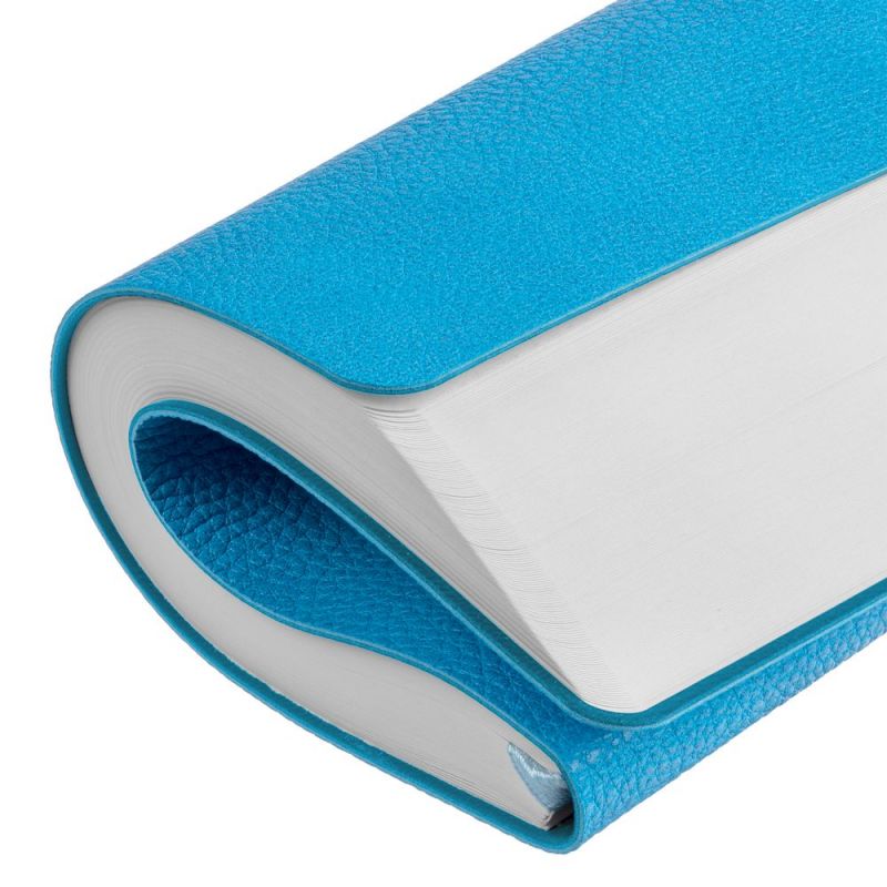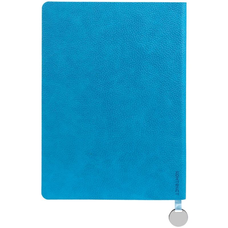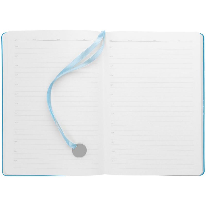 Ежедневник с гибкой обложкой, выполнен из материал La Fite, голубой JJ, дополнен ляссе в цвет обложки с металлическим шильдом.