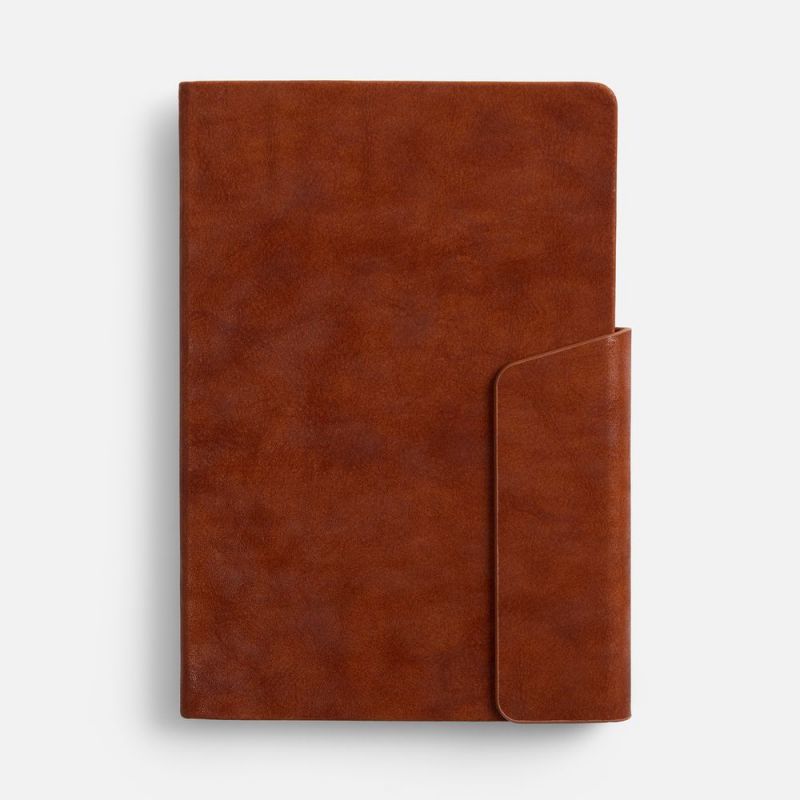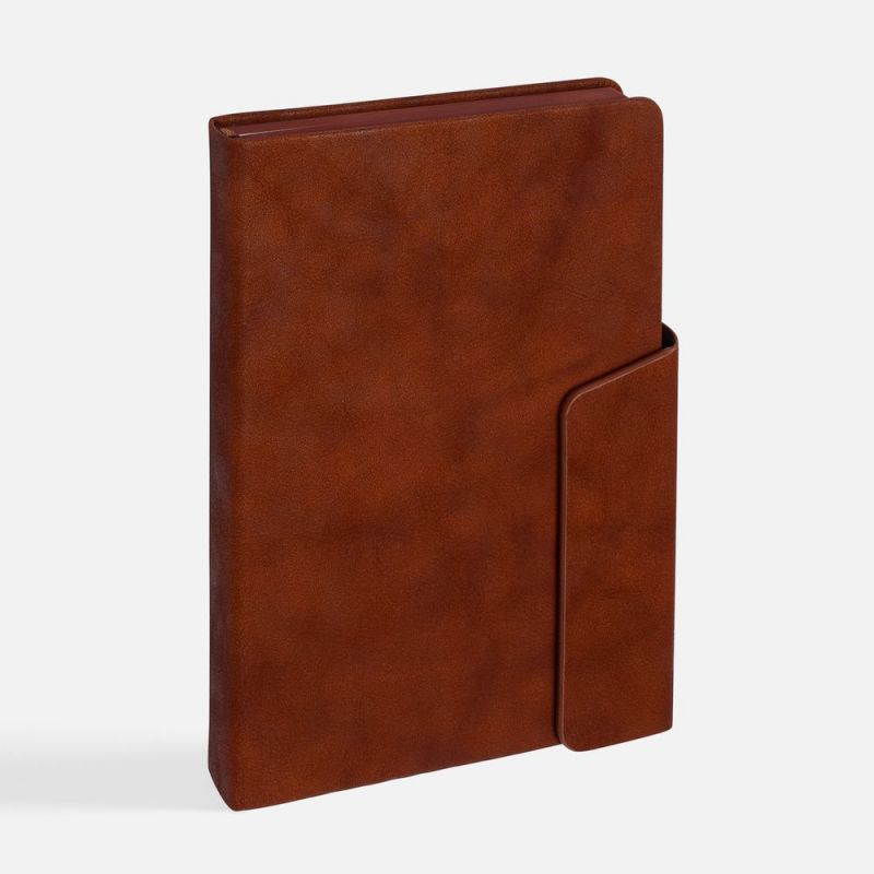 Ежедневник с твердой обложкой и фигурным магнитным клапаном, дополнен капталом и двойным ляссе.