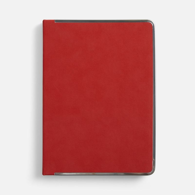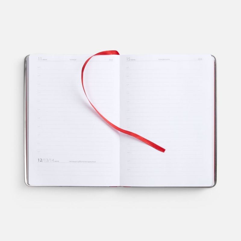 Ежедневник с твердой обложкой и серебристым обрезом блока. Выполнен из материала Nubuck, красный РР, дополнен красным ляссе и металлическими рамками с двух сторон обложки.