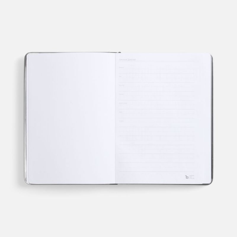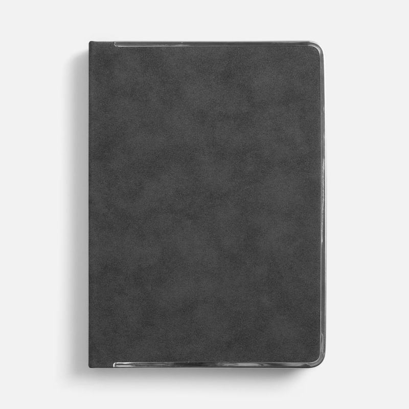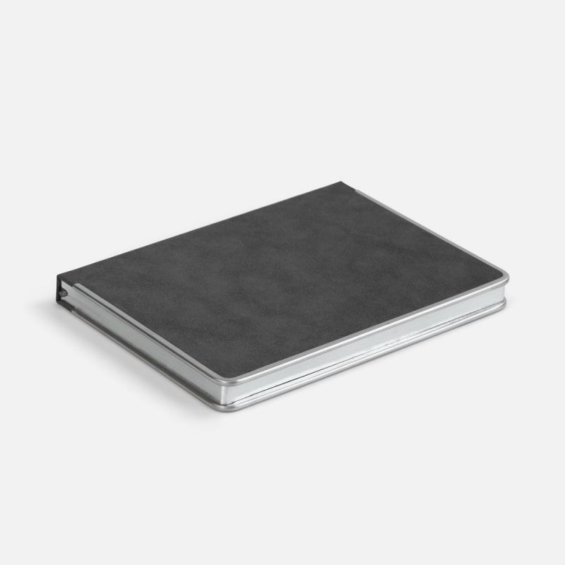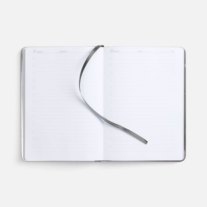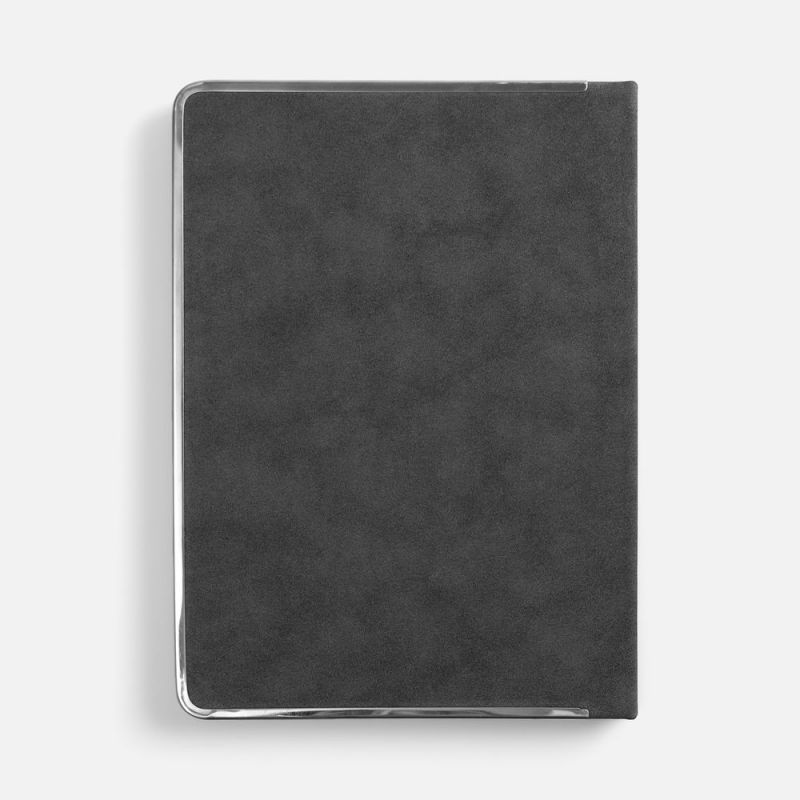 Ежедневник с твердой обложкой и серебристым обрезом блока. Выполнен из материала Nubuck, темно-серый ЕЕ, дополнен серым ляссе и металлическими рамками с двух сторон обложки.