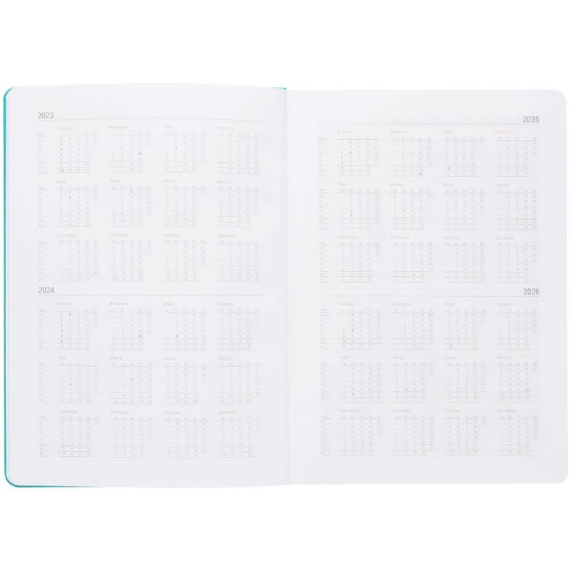 Ежедневник с твердой обложкой, выполнен из материала Latte, цвет морской волны II, обрез бирюзового цвета, дополнен ляссе бирюзового цвета и резинкой с металлическим шильдом.
