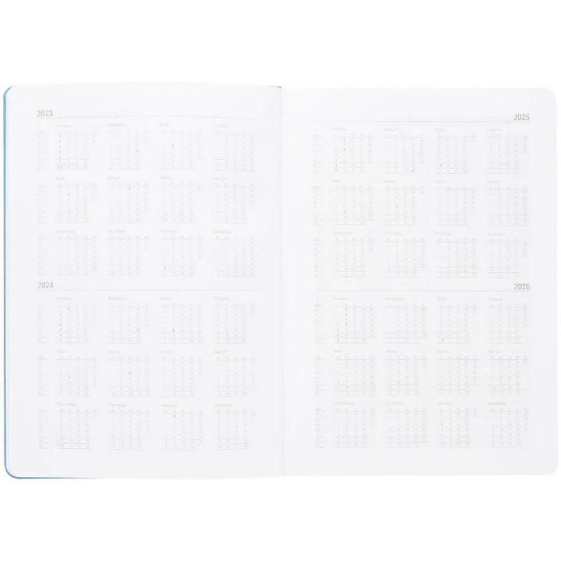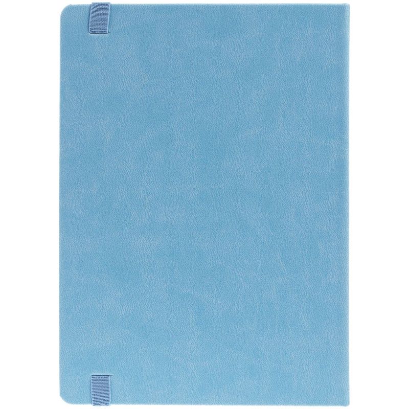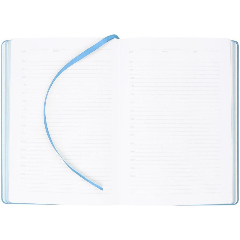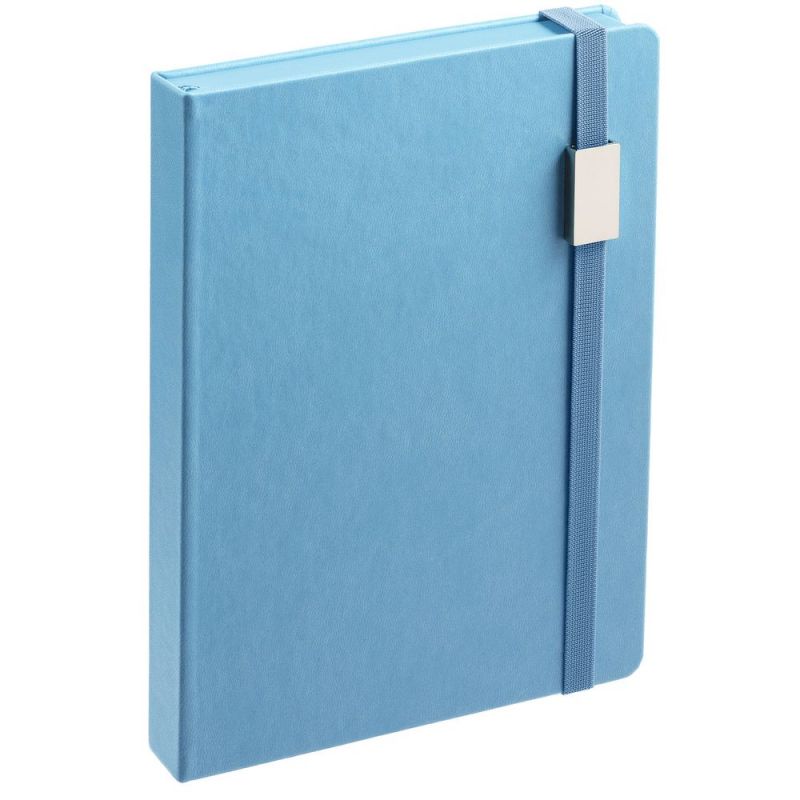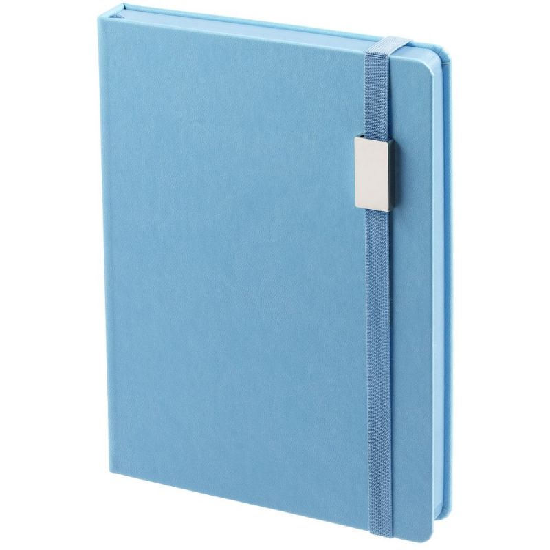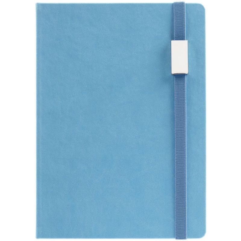 Ежедневник с твердой обложкой, выполнен из материала Latte, голубой JJ, обрез голубого цвета, дополнен ляссе голубого цвета и резинкой с металлическим шильдом.