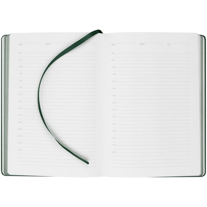 Ежедневник с твердой обложкой, выполнен из материала Latte, зеленый FF, обрез зеленого цвета, дополнен ляссе зеленого цвета и резинкой с металлическим шильдом.