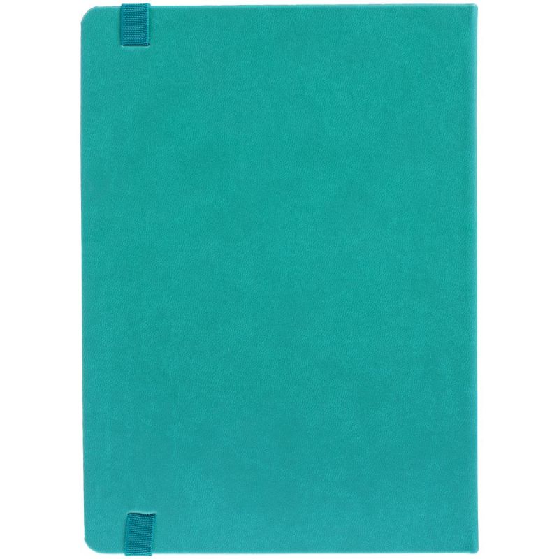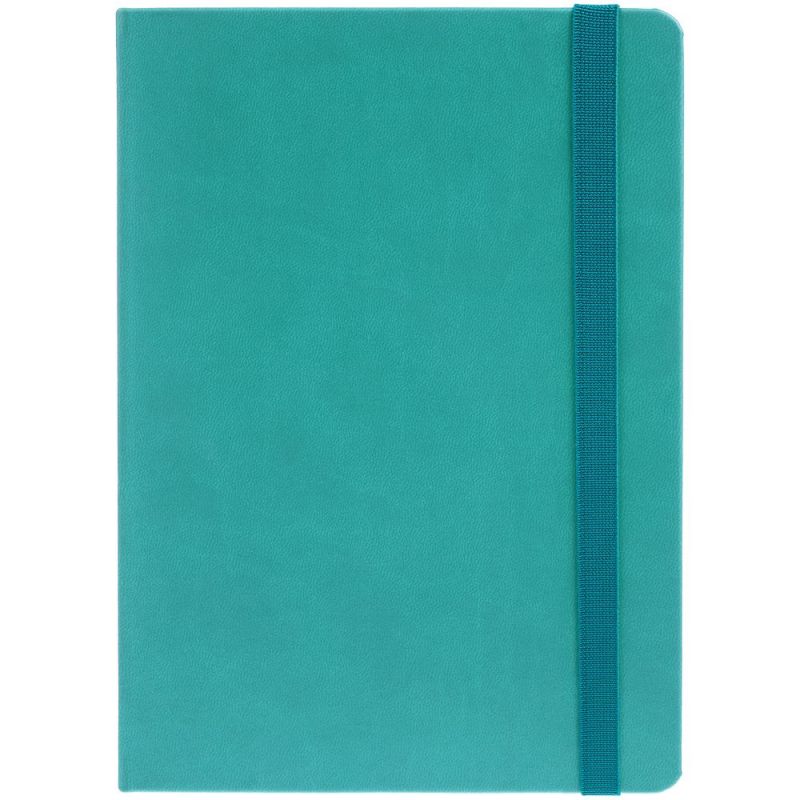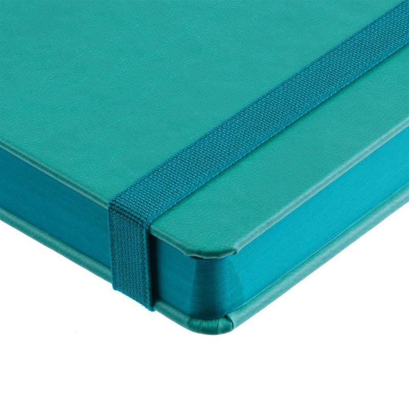 Ежедневник с твердой обложкой, выполнен из материала Latte, цвет морской волны II, обрез бирюзового цвета, дополнен резинкой и ляссе бирюзового цвета.