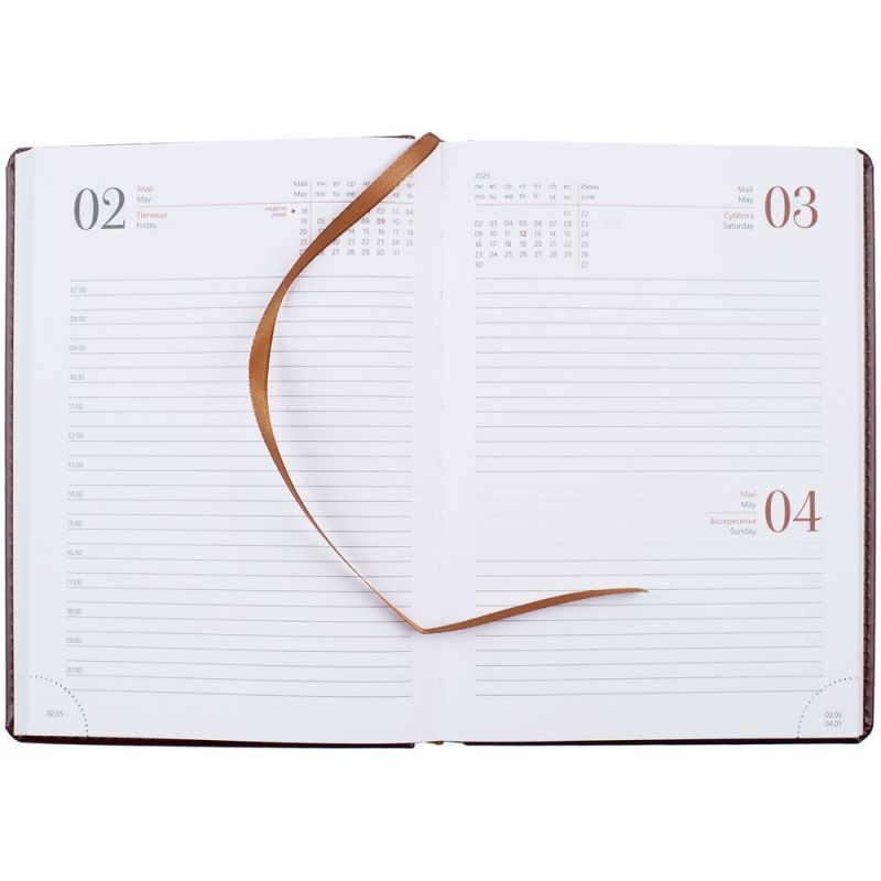Ежедневник с твердой обложкой без поролона, выполнен из материала Nebraska, коричневый RR, дополнен ляссе и капталом в цвет обложки.