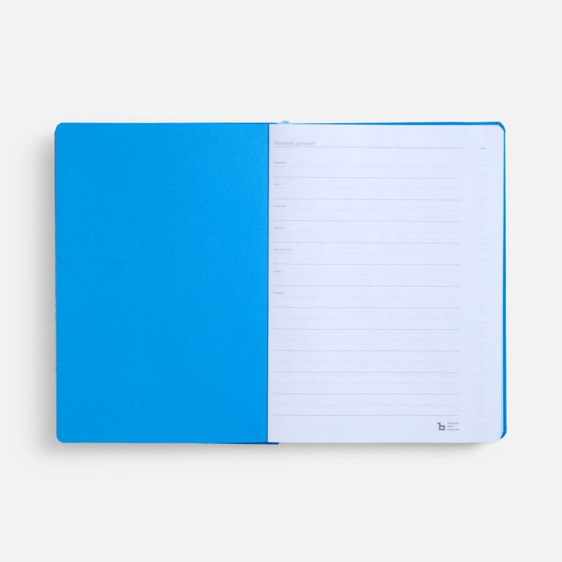 Ежедневник с твердой обложкой, выполнен из материала Nice Touch, голубой JJ, дополнен резинкой с шильдой из материала Soft Touch Ultra и ляссе в цвет обложки.