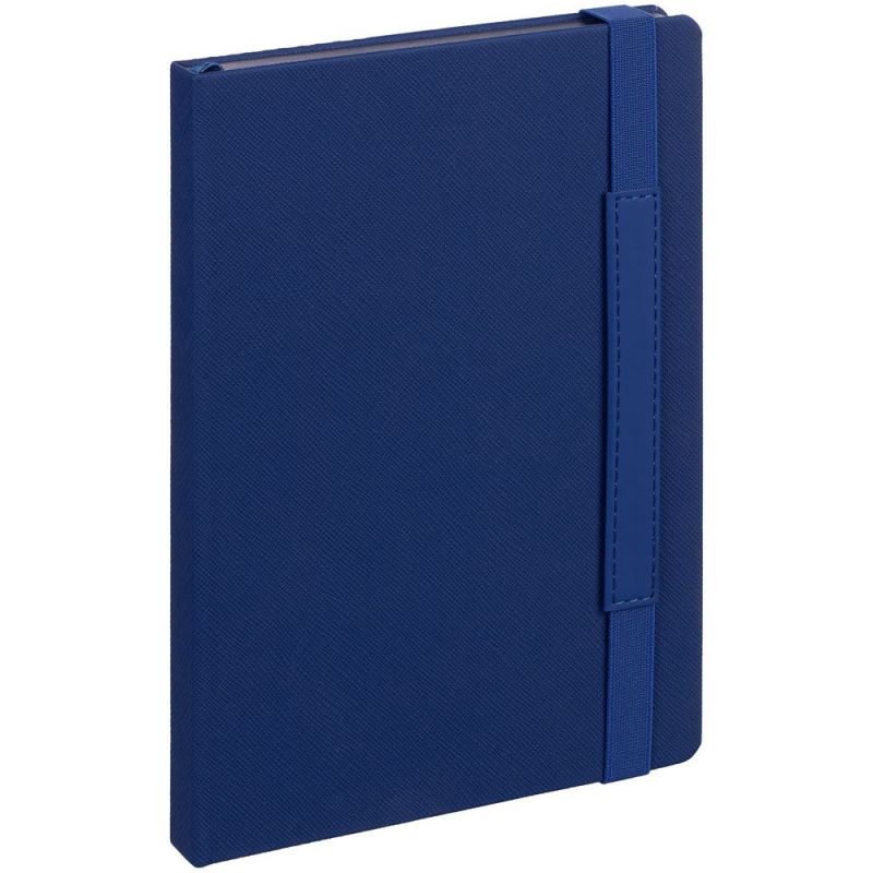 Ежедневник с твердой обложкой, выполнен из материала Nice Touch, синий, дополнен резинкой с лейблом из материала Soft Touch Ultra и ляссе в цвет обложки.