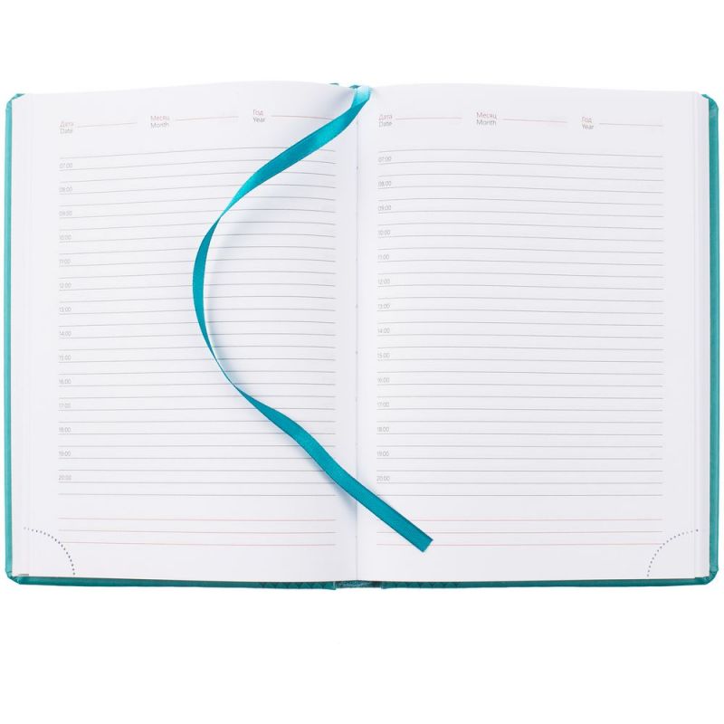 Ежедневник с твердой обложкой, выполнен из материала Waltz, морская волна II, дополнен ляссе в цвет материала.