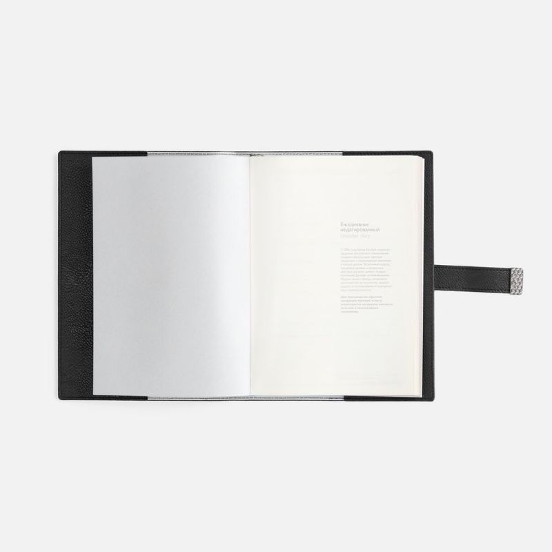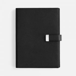 Ежедневник в мягком переплете со съемной обложкой, дополнен застежкой-хлястиком с металлическим шильдом на кнопке, двойным ляссе и капталом.