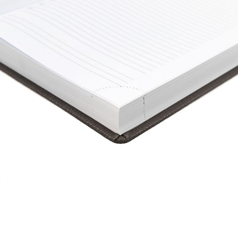 Ежедневник в твердой обложке c поролоном, выполнен из материала La Fite, темно-серый EE, дополнен ляссе серого цвета и прошивкой по периметру обложки.