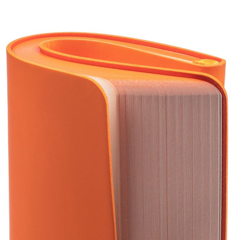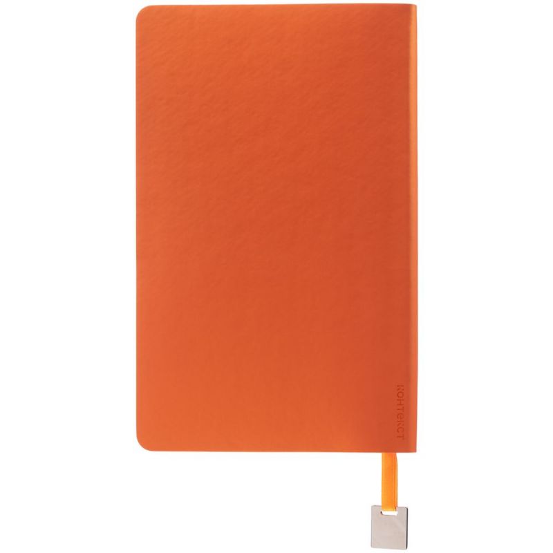 Ежедневник с гибкой обложкой, выполнен из материалов Soft Touch Pearl, оранжевый ОО, и Latte, оранжевый (внутренняя часть обложки), дополнен ляссе в цвет обложки с металлическим шильдиком.