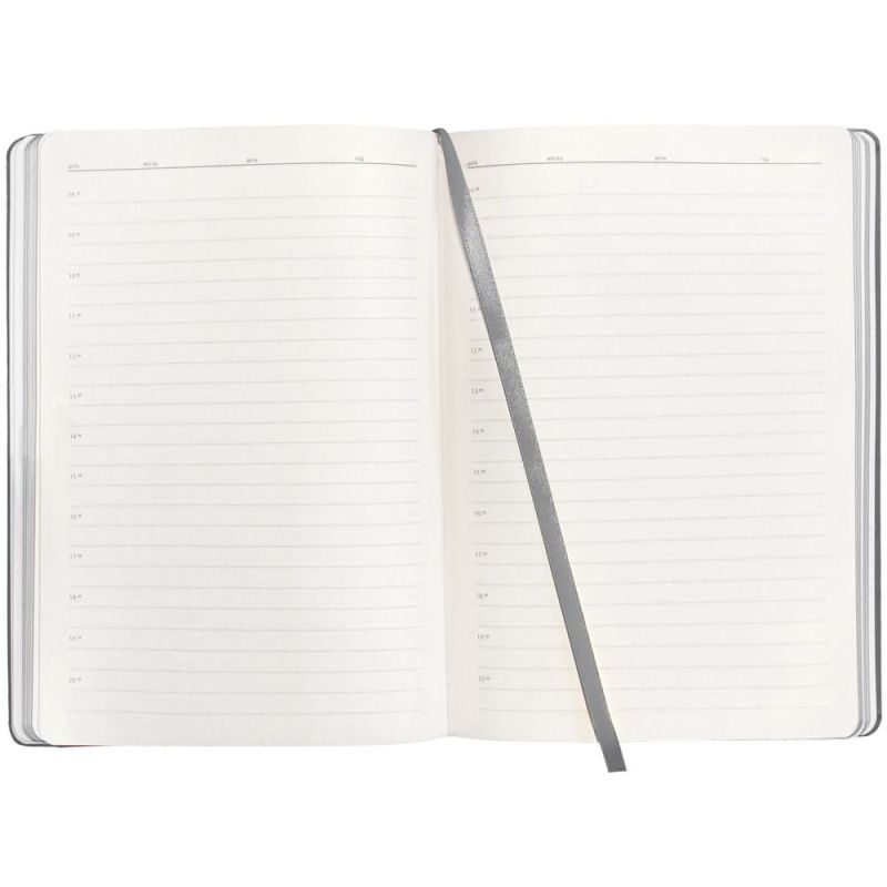 Ежедневник с гибкой обложкой, выполнен из материалов Soft Touch Pearl, серый СС, и Latte, серый (внутренняя часть обложки), дополнен ляссе в цвет обложки с металлическим шильдиком.