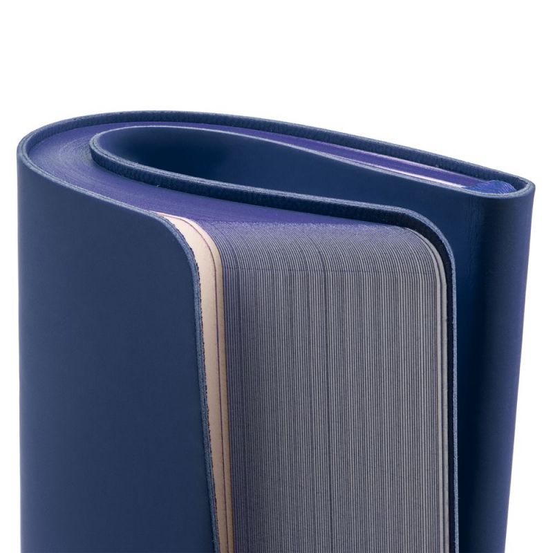 Ежедневник с гибкой обложкой, выполнен из материалов Soft Touch Pearl, синий НН, и Latte, темно-синий (внутренняя часть обложки), дополнен ляссе в цвет обложки с металлическим шильдиком.